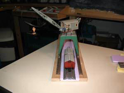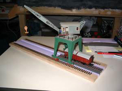 Een op de kop getikte havenkraan moest op rails komen die dus wat verder uit elkaar ligt als normaal. Omdat het een gedoe is om de gezaagde rails goed op maat te leggen (evenwijdig) op de baan heb ik deze maar op een plaatje gelijmd en na het drogen door midden gezaagd. Vervolgens heb ik deze strookje op een ander plaatje gelijmd. Het geheel word dan verzonken in de baan geplaatst. Maar voor dat dit gebeurd, word het geheel eerst verder afgewerkt.