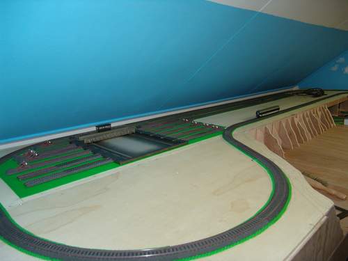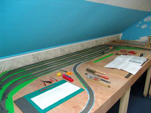 Enfin, de hoofdbaan ligt nu in ieder geval en deze zal eerst worden aangesloten en voor controle aan de PC met Win-digipet worden gekoppeld voor een stevige testperiode. Maar tussendoor komen er ook nog zijlijnen bij van K-rail en een 2 rail Trambaantje.