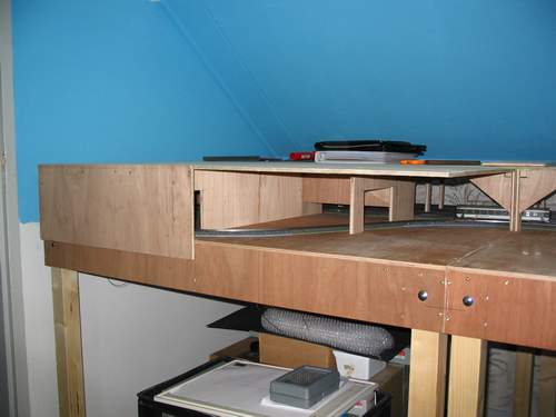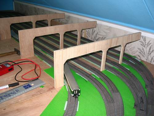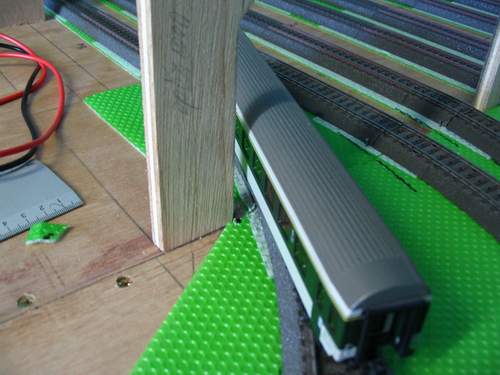 Het volgende karwei zal zijn, de rails zagen boven de "kapnaden", bezet/terugmeld -draden aansluiten (solderen aan de rails) en de extra rails aansluitingen voor de spanning. pfffffffft, maar nu komt er een beetje schot in de zaak (baan)..