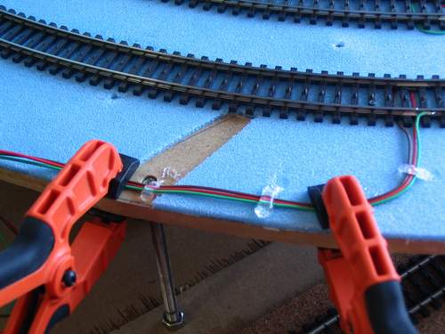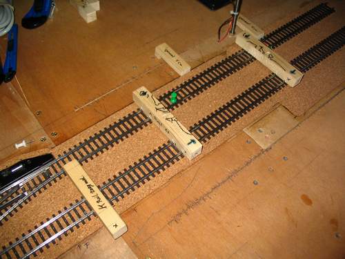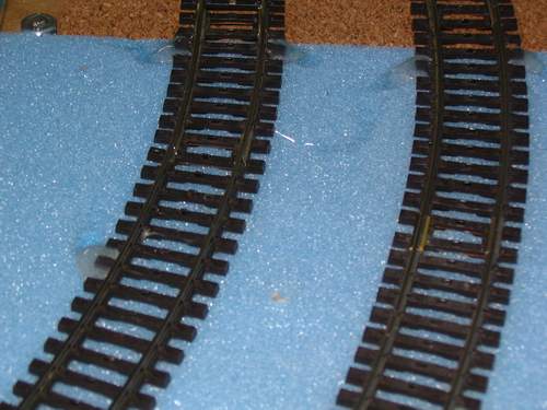De rails worden tijdelijk met kleine schroefjes vast gezet en later, na het ballasten, weer verwijderd zodat het dempingeffect van het kruk weer terug komt.