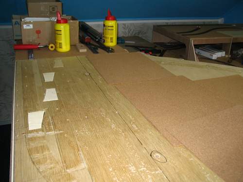 Na eerst de platen te hebben verschoond van alle voorgaande isolatiemateriaal en dubbelzijdige tape wordt er eerst een kurklaag terug gelegd.