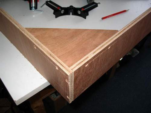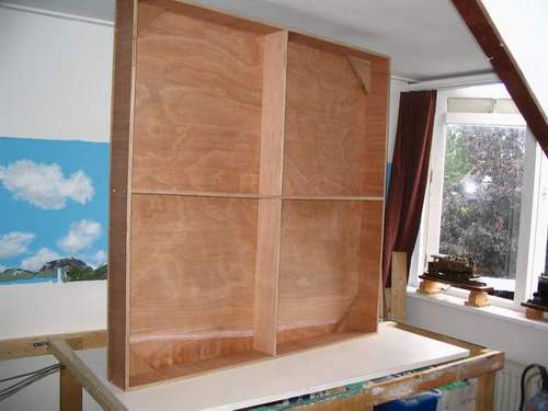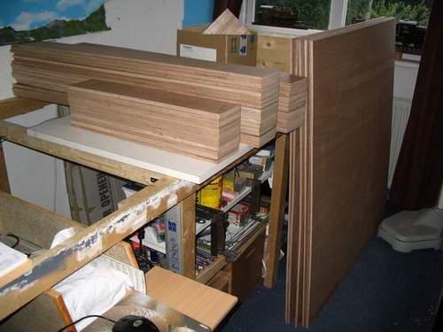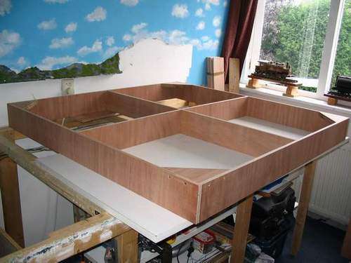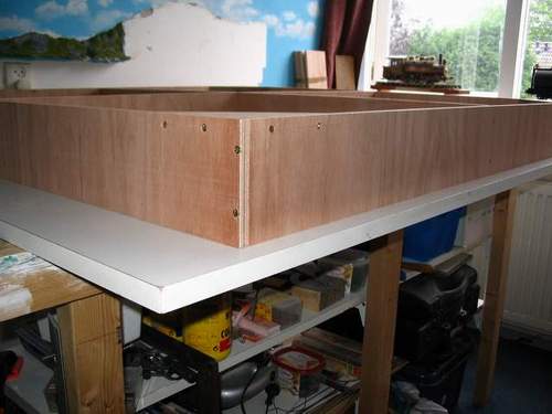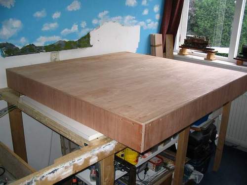 Nog even de exacte maten: Hoogte: 1ste niveau (bovenkant bovenblad tot de vloer) is 90 Cm. Bovenbladmaten; 122 x 122 Cm x 9 mm (dikte). Opstaande kanten; 12 Cm hoog x 12 mm dikte. Hoekstukken; 15 x 15 Cm x 22 mm dikte. Openframe (vakken) worden ± 60 x 60 Cm. Zonodig zal op 30 Cm hier nog een extra ondersteuning komen om de tracés vlak te houden mocht de 9 mm plaat iets gaan "trekken".