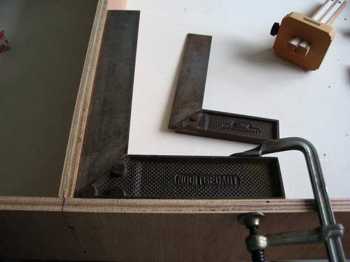 Dit is het resultaat, haaks dus. Zet ook hartlijnen waardoor de schroeven precies in het hart van de kopse zijde van de spanten komen, dit voorkomt, misboren/schroeven en splijten/scheuren van het toch al dure hout. Tegenwoordig is hout "Goud". De lijnen komen later ook weer van pas.