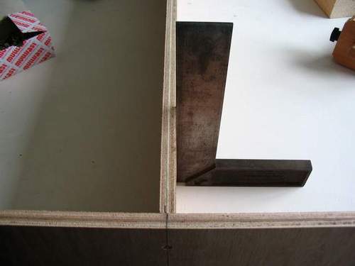 Op onderstaande afbeelding worden de hoeken haaks op elkaar gezet om deze vervolgens netjes vast te kunnen schroeven. Het is zeer belangrijk om de onderbouw goed haaks en strak op te bouwen. Hiermee valt of staat de toekomstige modelspoorbaan. Neem er de tijd voor en controleer desnoods tien keer alles wat u doet en wilt gaan doen, dus eerst kijken, dan denken en tot slot, doen.