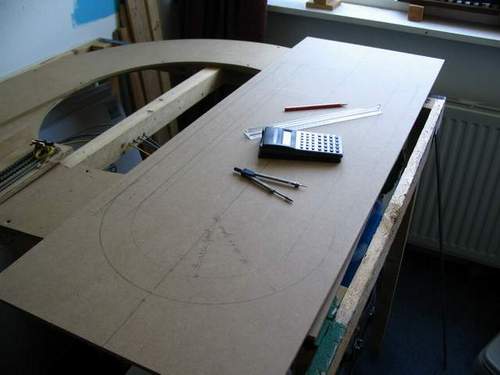 Omdat ik het niet zie zitten om iedere bocht apart af te gaan zitten tekenen op de baan heb ik een begin gemaakt voor het maken van een mal. Hier mee kan ik dan straks lekker makkelijk op de platen (dikte * 8 mm), welke bestemd zijn voor het FCS, de boel aftekenen,