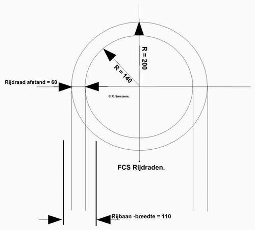 De radius voor de binnenbocht (rijdraad) wordt dan R = 140 mm.