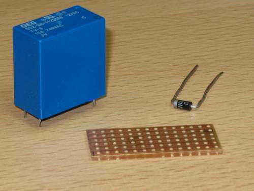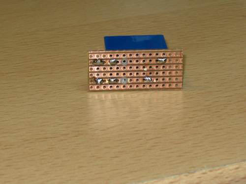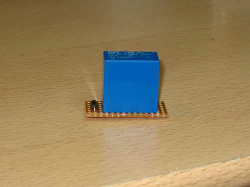 Hiervoor is een stukje print van een grotere print gezaagd net groot genoeg voor het relais (1x om) een diode en ruimte voor de aansluitingen van de draadjes aan weerszijde van de print.
