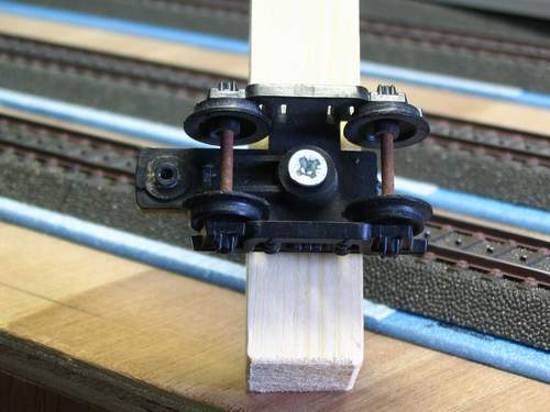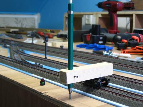 De breedte, naast de rail(s) bepaalt u natuurlijk zelf. Zorg wel dat het wielstel haaks op het latjes staat en het gat waar het potlood doorheen wordt geplaatst ook haaks en precies in het midden zijn. Ook op platte bakwagons is iets dergelijks te maken.